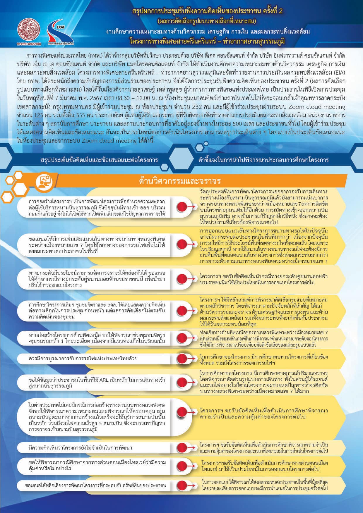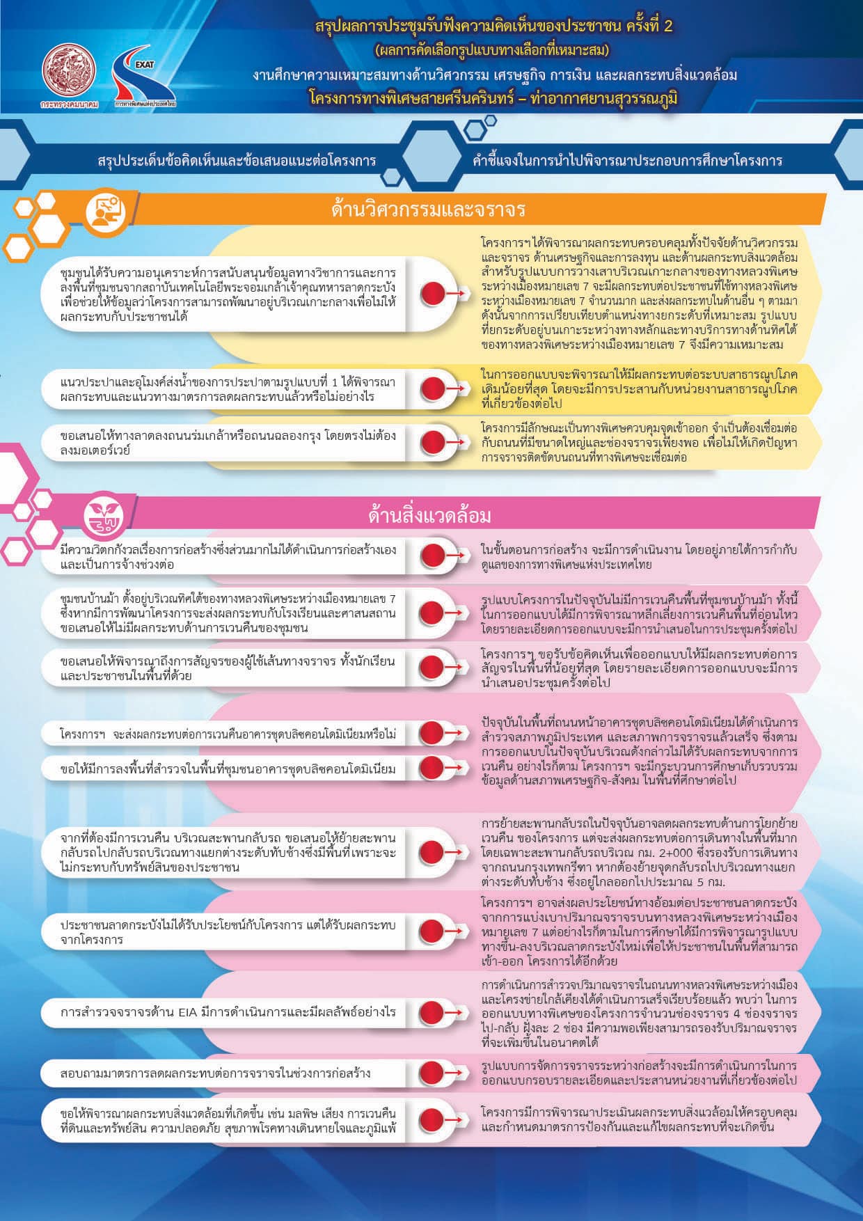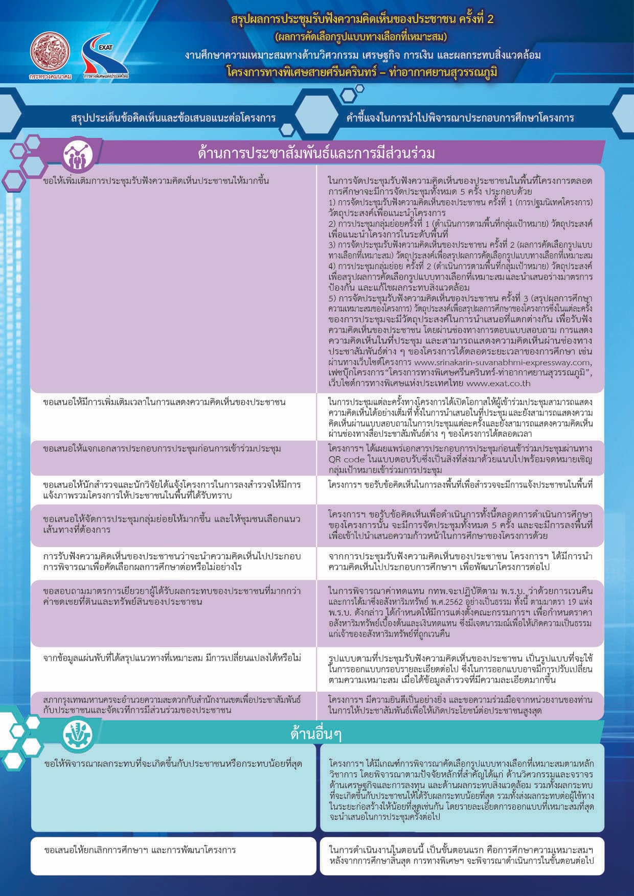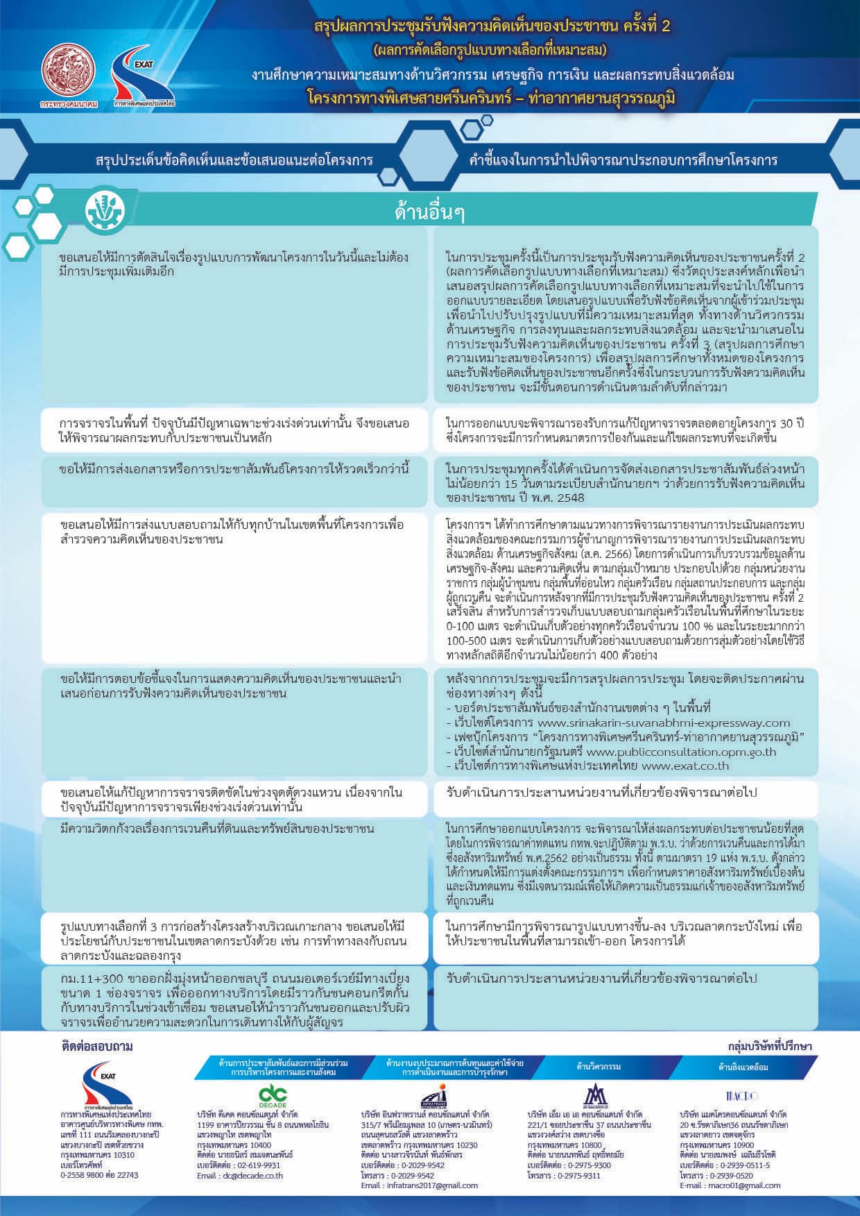 สรุปผลประชุมรับฟังความคิดเห็นของประชาชน ครั้งที่ 2 (ผลการคัดเลือกรูปแบบทางเลือกที่เหมาะสม) งานศึกษาความเหมาะสมทางด้านวิศวกรรม เศรษฐกิจ การเงิน และผลกระทบสิ่งแวดล้อม โครงการทางพิเศษสายศรีนครินทร์ – ท่าอากาศยานสุวรรณภูมิ