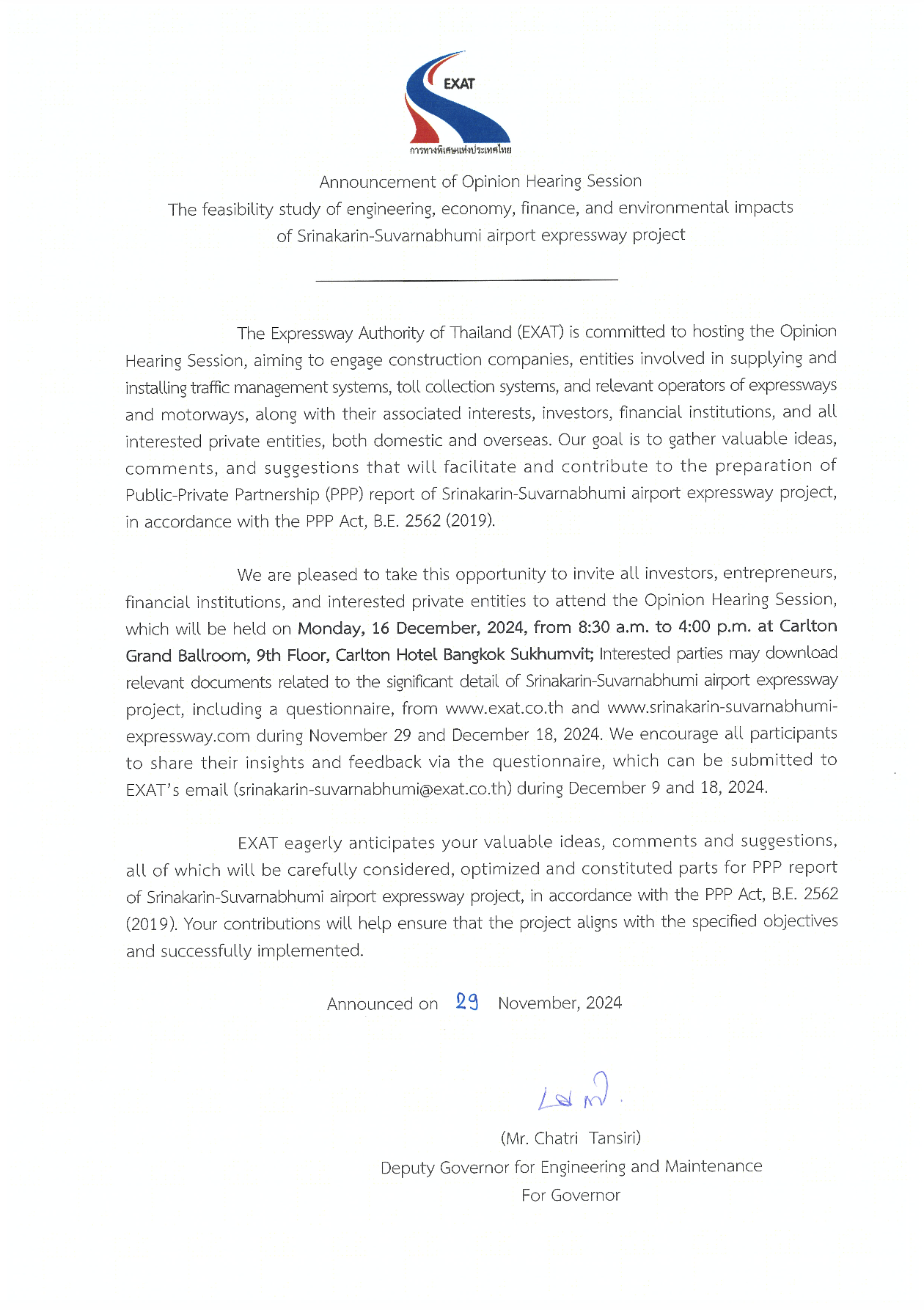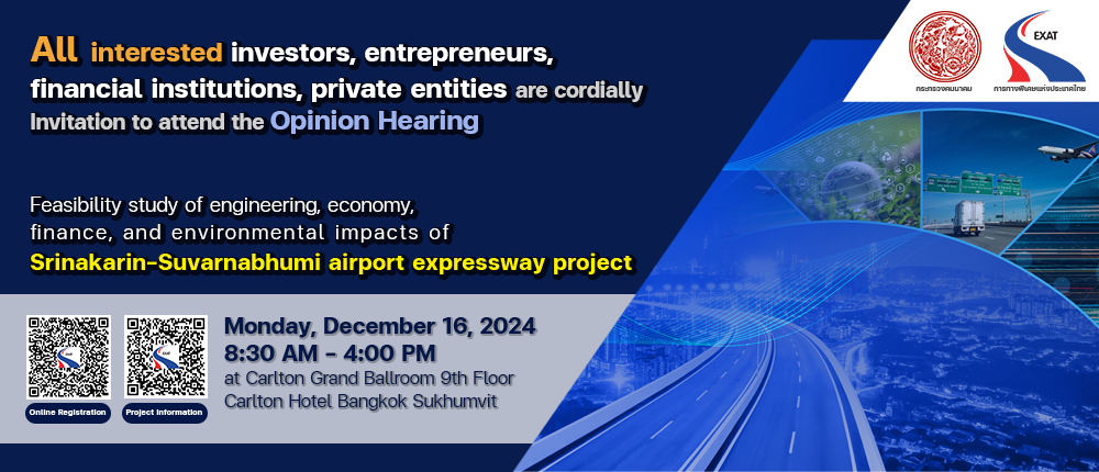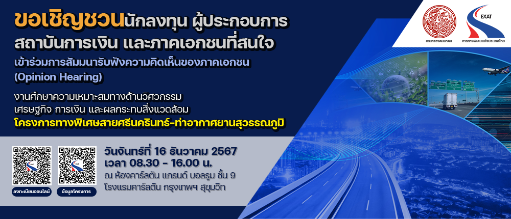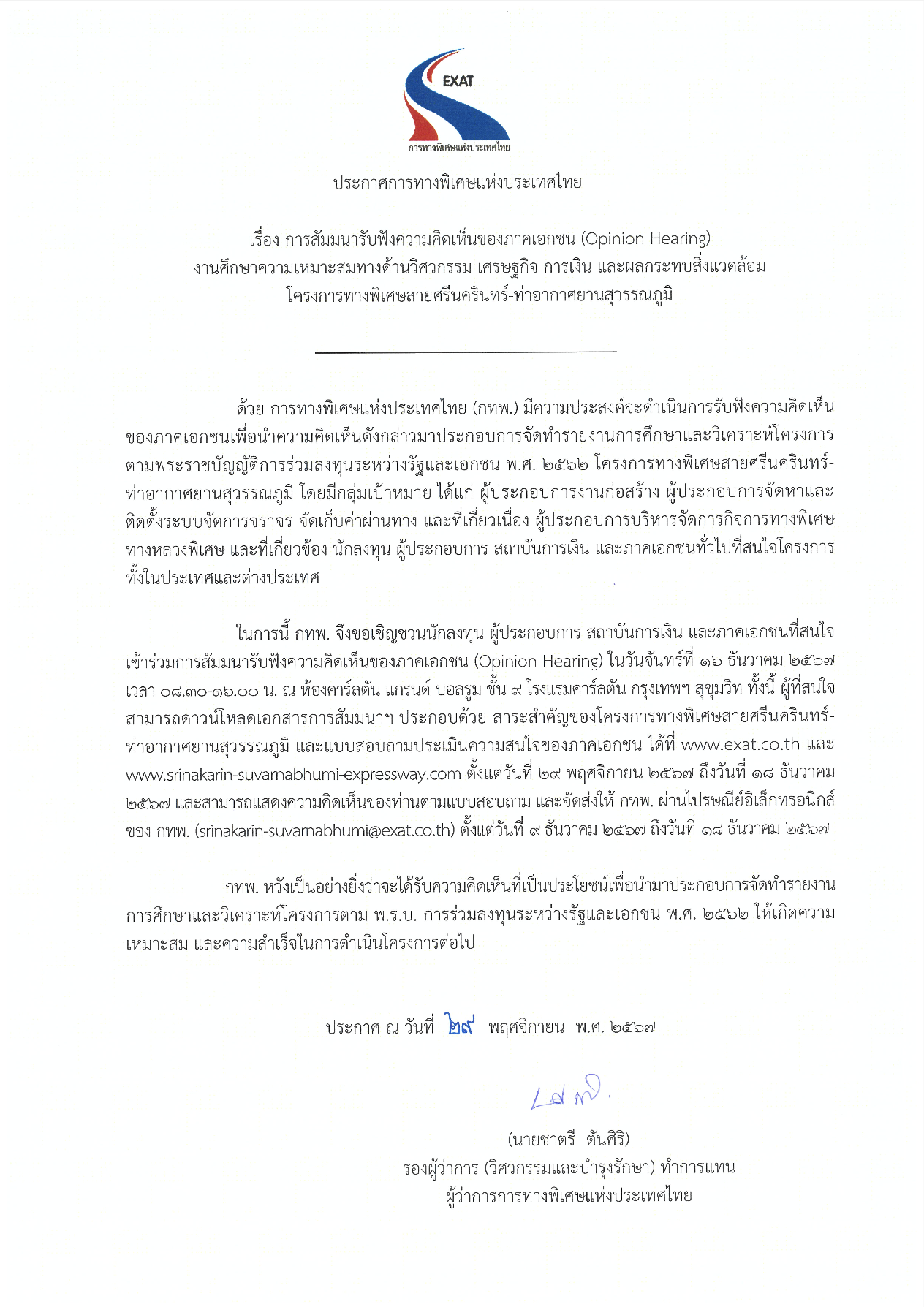 📢 ประกาศ กทพ. เรื่อง การสัมมนารับฟังความคิดเห็นของภาคเอกชน (Opinion Hearing) 📝📃 งานศึกษาความเหมาะสมทางด้านวิศวกรรม เศรษฐกิจ การเงิน และผลกระทบสิ่งแวดล้อม โครงการทางพิเศษสายศรีนครินทร์-ท่าอากาศยานสุวรรณภูมิ ✈️
