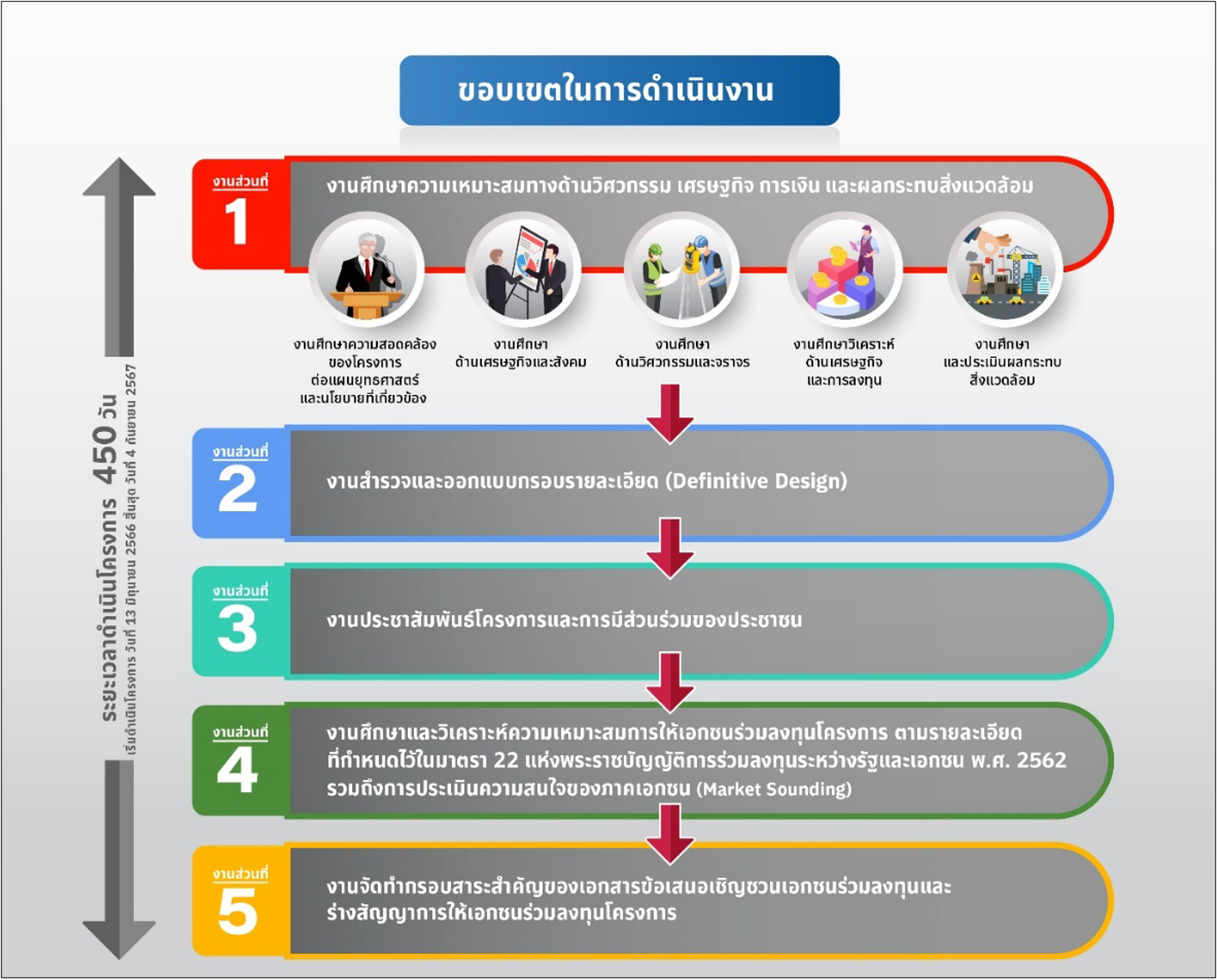ในการดำเนินงานศึกษาความเหมาะสมทางด้านวิศวกรรม เศรษฐกิจ การเงิน และผลกระทบสิ่งแวดล้อม โครงการทางพิเศษสายศรีนครินทร์ – ท่าอากาศยานสุวรรณภูมิ ได้แบ่งงานออกเป็น 5 ส่วน ดังนี้